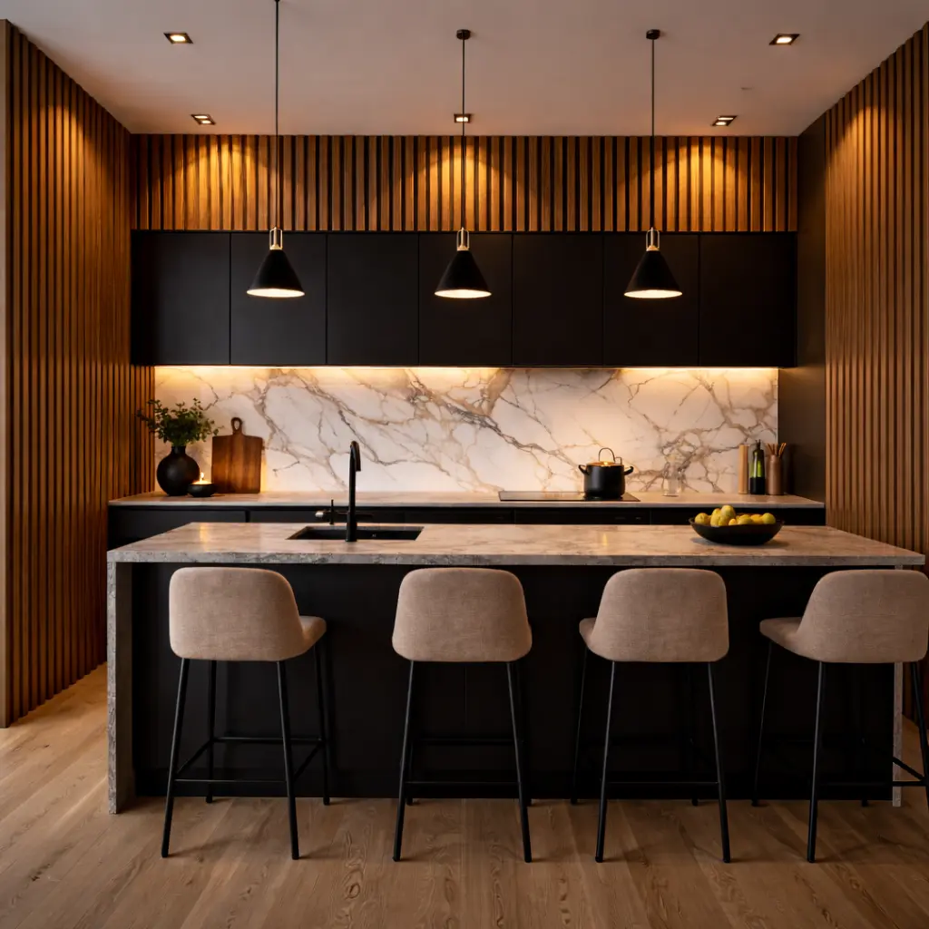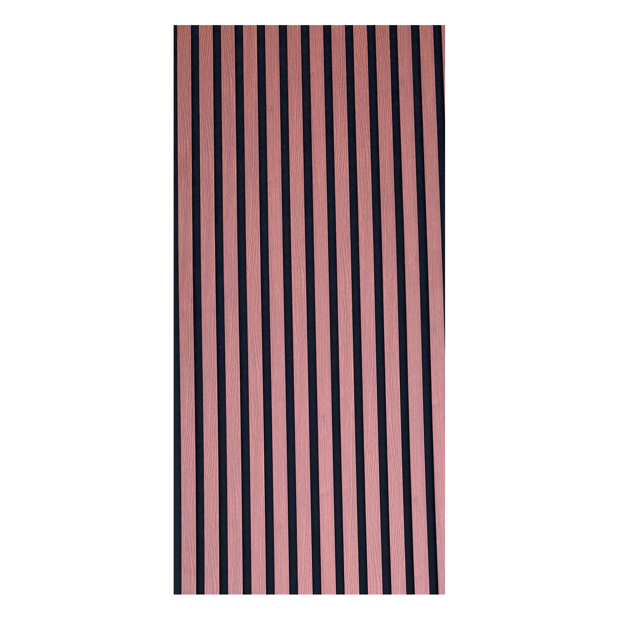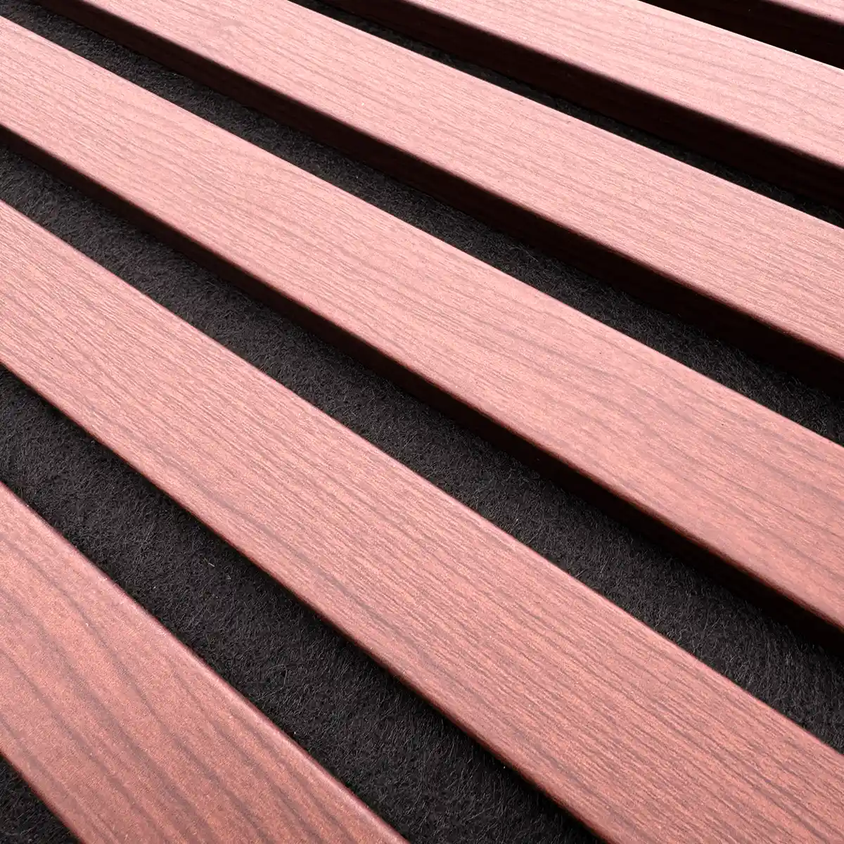 De MDF-latten zijn aan 3 zijden afgewerkt met PVC houtlook fineer in kastanje eiken. Daardoor zie je geen onafgewerkte randen, ook niet vanaf de zijkant. De vilten achterkant zorgt voor de geluidsabsorptie en brengt de NRC-waarde op 0.75. Dat betekent dat driekwart van het geluid wordt geabsorbeerd, waardoor nagalm en echo merkbaar verminderen.